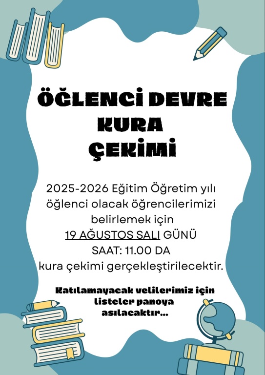 2025-2026 EĞİTİM ÖĞRETİM YILI ÖĞLENCİ OLACAK ÖĞRENCİLERİMİZ İÇİN KURA ÇEKİMİ 19 AĞUSTOS 2025 SAAT 11.00' DA KURA ÇEKİMİ YAPILACAKTIR.